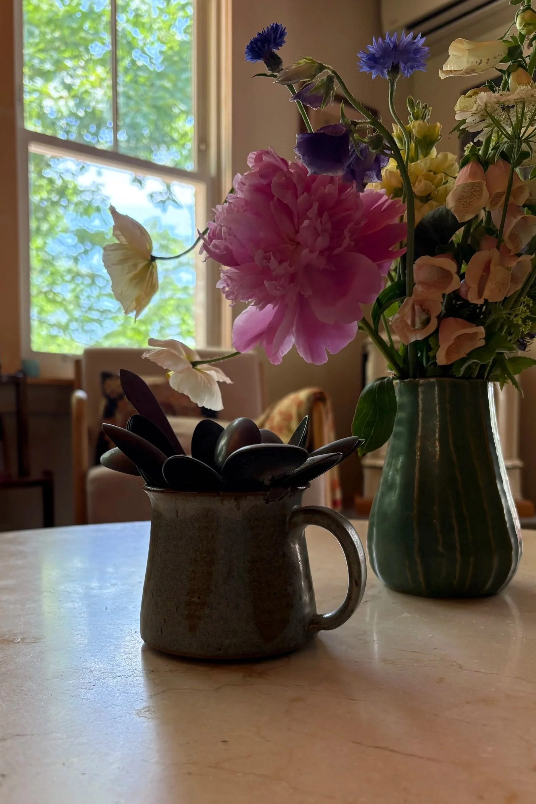 Her beloved grey ceramic mug sits perched on my altar, filled with a small cluster of my grandmother’s tarnished silver spoons—a simple vessel signifying memory, lineage, and quiet devotion.